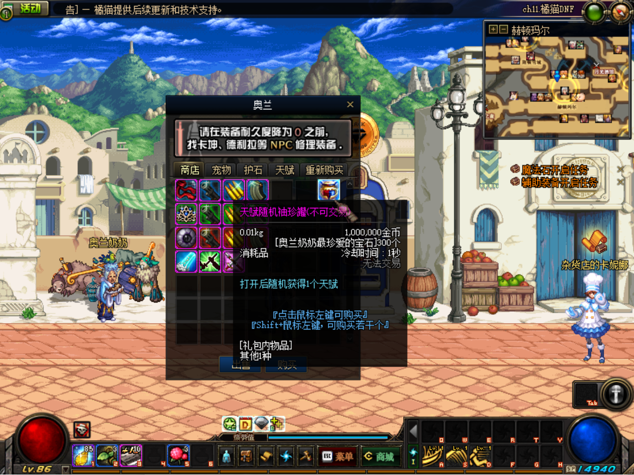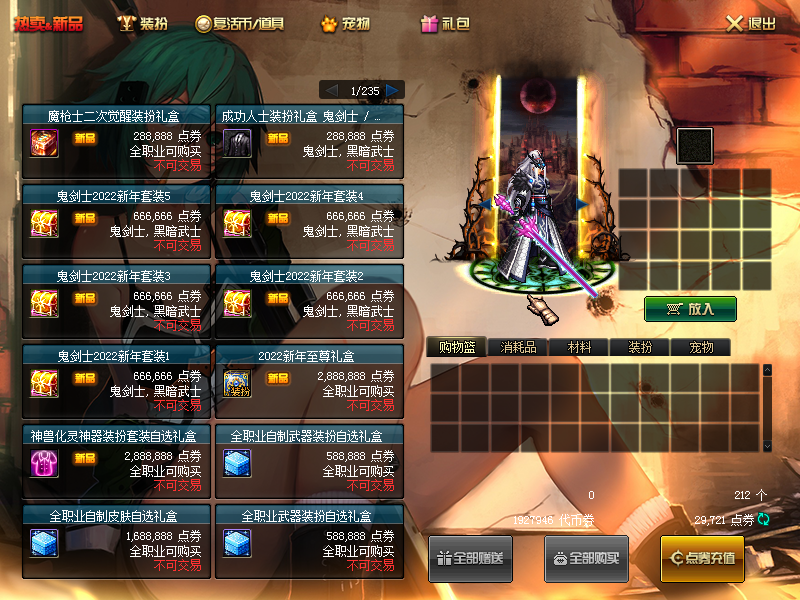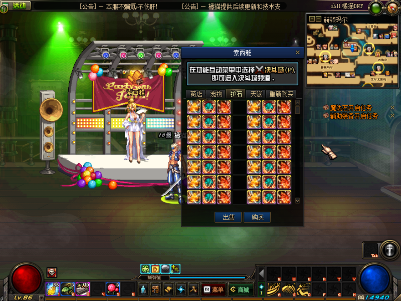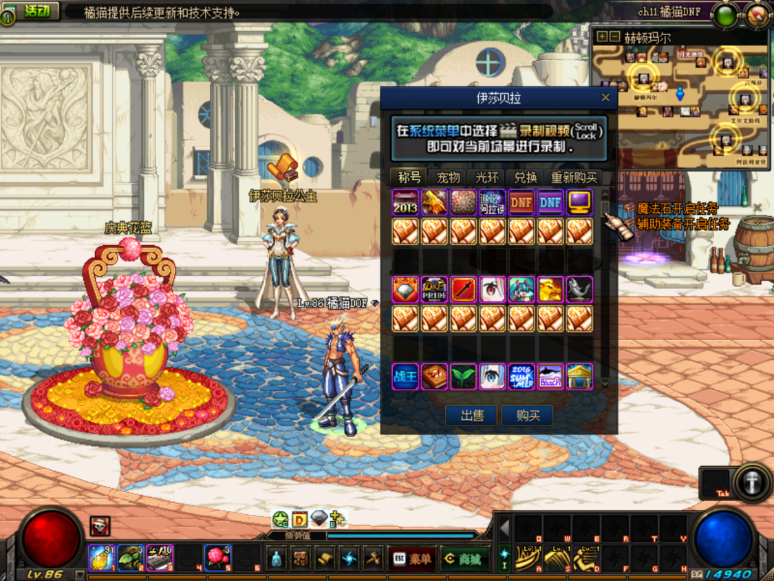 商城出售大量实用道具(花篮,PL药,+10增幅卷,+12强化卷,深渊票、橘猫硬币,SP/TP道具,各种药品,普通装备强化保护卷,大量时装)